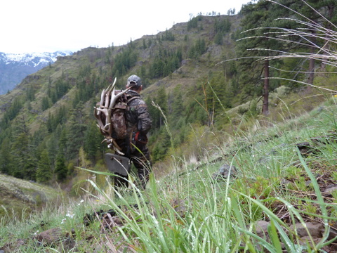 Bear hunting is all about figuring out what bears like to eat, finding their food source, and waiting for the bears to show up. Bears eat whatever is nutritious and abundant at the time, so the food sources keep changing month to month. We glassed and glassed the green hillsides and valleys, looking for bears. By Saturday, we managed to get ourselves situated in a good location. One fun side benefit of spring bear hunting is looking for shed antlers at the same time. Elk and deer drop their antlers between January and April. If you figure out where the animals were at that time, you can really clean up. We hunt places where other hunters rarely go and we actually found antlers from both this year and last year. For die-hard elk hunters like us, making an antler haul like this is worth the trip all by itself. By Saturday afternoon, we finally found “bear valley.” I watched a large chocolate colored bear for about an hour while my buddy, Brandon, worked his way up the opposite side of the canyon. As Brandon worked his way along, he spotted another chocolate bear and quickly put it down with his Browning .270. Fifteen minutes later, he spotted the large bear I’d been watching and it was climbing up my side of the canyon, coming right toward me. It was below the rimrocks and I couldn’t see it. I left the goats on the hillside and scrambled down the hillside, but the bear disappeared into the dense brush, never to be seen again.