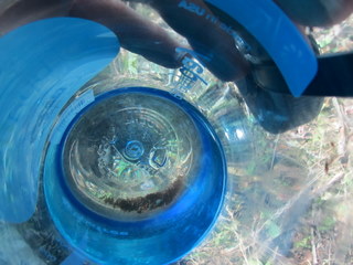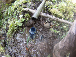 We managed to find a muddy “seep” on a hillside. There was no running water there, so we scratched some grooves into the hillside with a stick to channel the water and then tried various ways to get the water to form a small waterfall to make it easier to pour into our water bottles while avoiding as much solid debris as possible. Luckily, this area had been used as a water source in the past and someone left a short piece of pvc pipe nearby. Having a piece of pipe is a huge help in channeling water (I guess that’s obvious, but when you’re out in the woods and trying to come up with a pipe-less solution, it’s really difficult). The water wasn’t completely free of debris, but it was pretty good.