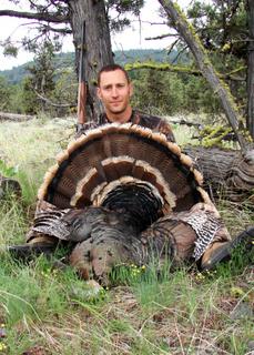 So, we drove to eastern Oregon with a simple plan: locate turkeys, call turkeys into range, convert live turkeys into turkey dinner. We arrived on Friday afternoon, setup camp, and quickly found a tom strutting that evening. It was game on! We circled above him in the trees, then setup to call him in: Chad was calling, I was sitting with my back to a tree about 20 yards in front to the right, and Brandon setup on the left. Since Brandon hadn’t bagged a turkey yet this season, he was on point with first choice on where to setup for the best shot. Chad started making “cutting” calls with his box call and the tom fired back a gobble immediately. That tom had probably never been hunted since he gobbled back steadily for ten minutes as Chad called to him. Gobblers that have been shot at once or twice quickly learn to be more quiet and wary. Lucky for us, this tom was ready to dance.